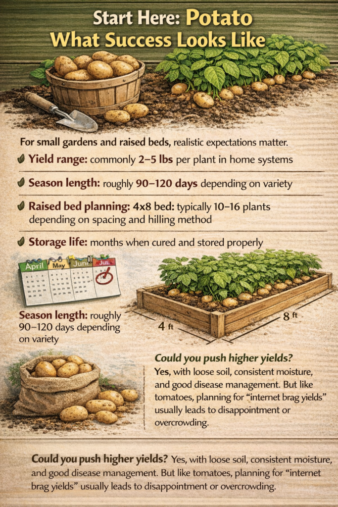 | Potatoes | ~25,000 lbs | Heavy producer underground; stores well. Seed tubers and soil mounding required. |