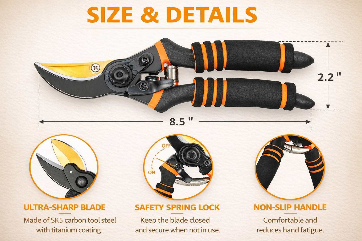 Professional 8.5″ garden shears with SK5 steel and titanium coating for sharp, clean cuts. Durable, ergonomic, and perfect for all gardening tasks.